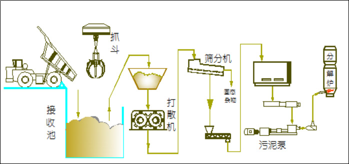 半固態(tài)廢物配伍后,卸入半固態(tài)廢物接收坑,再由抓斗抓入打散機(jī)進(jìn)行打散,打散后的物料經(jīng)篩分機(jī)將其中的固態(tài)雜物和大塊物料篩除,少量篩上物料另行處置。篩下物料(漿狀物料呈污泥狀)由螺旋輸送機(jī)輸送至污泥倉。倉內(nèi)漿狀物料由膏體泵輸送至窯尾高溫焚燒,系統(tǒng)配置除雜器,入窯口配置污泥噴槍。