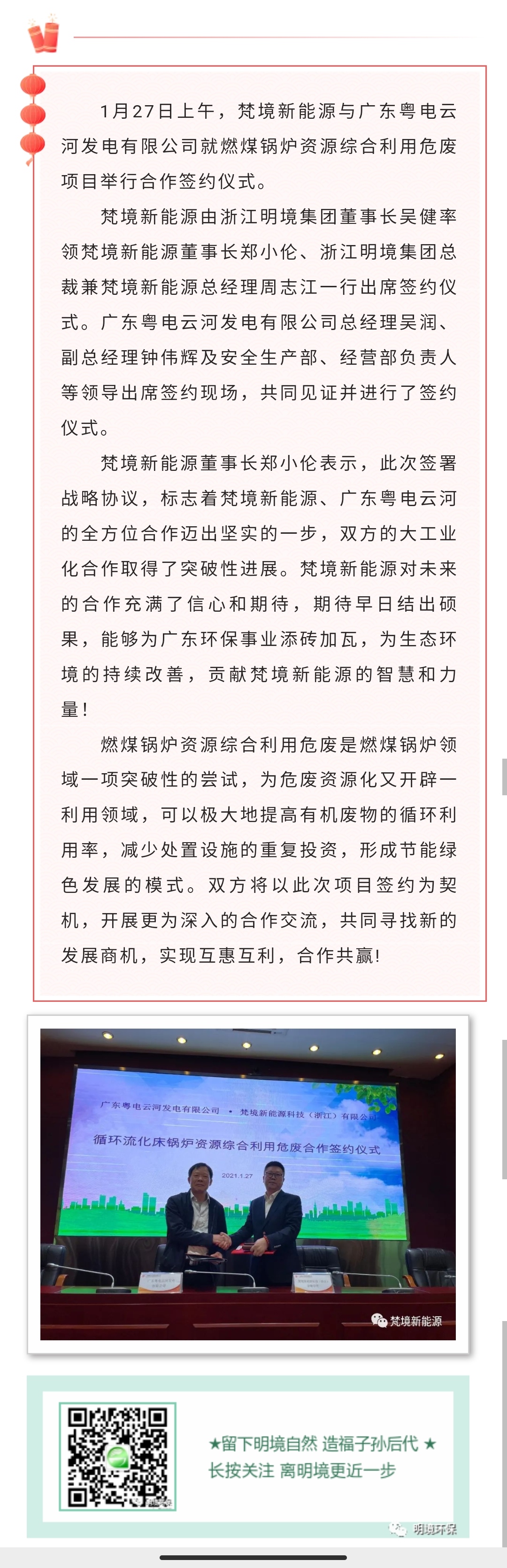明境環(huán)保集團旗下梵境新能源與廣東粵電云河舉行燃煤鍋爐項目合作簽約儀式