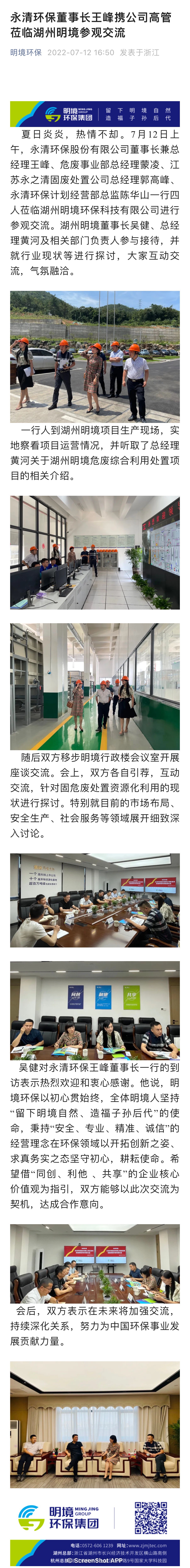 永清環(huán)保董事長(zhǎng)王峰攜公司高管 蒞臨湖州明境參觀交流